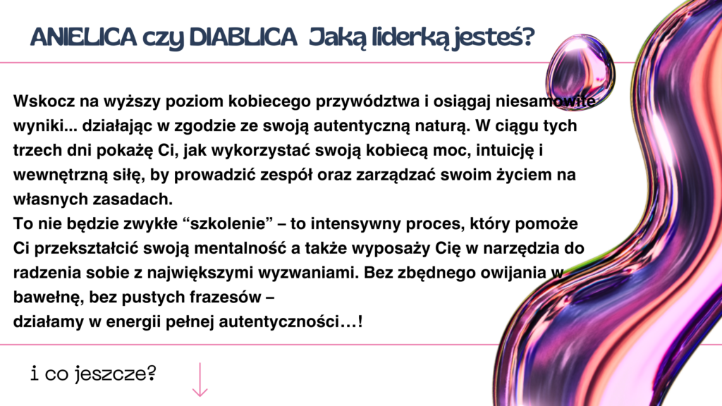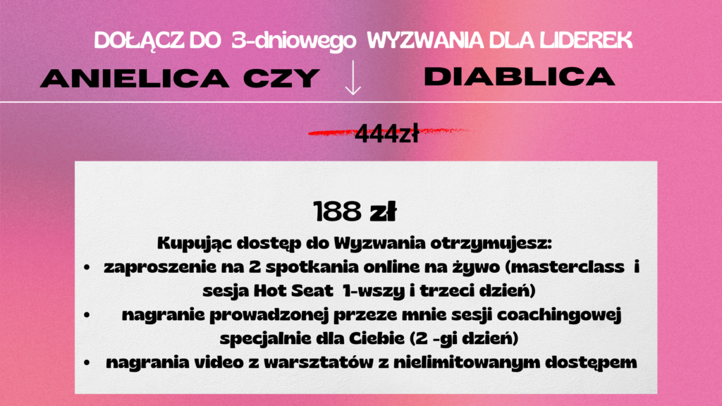 Twoje miejsce na wyzwaniu Anielica czy Diablica już czeka – dołącz do 3-dniowego wydarzenia, po którym to, w jaki sposób zarządzasz sobą i ludźmi już NIGDY nie będzie taki sam!
