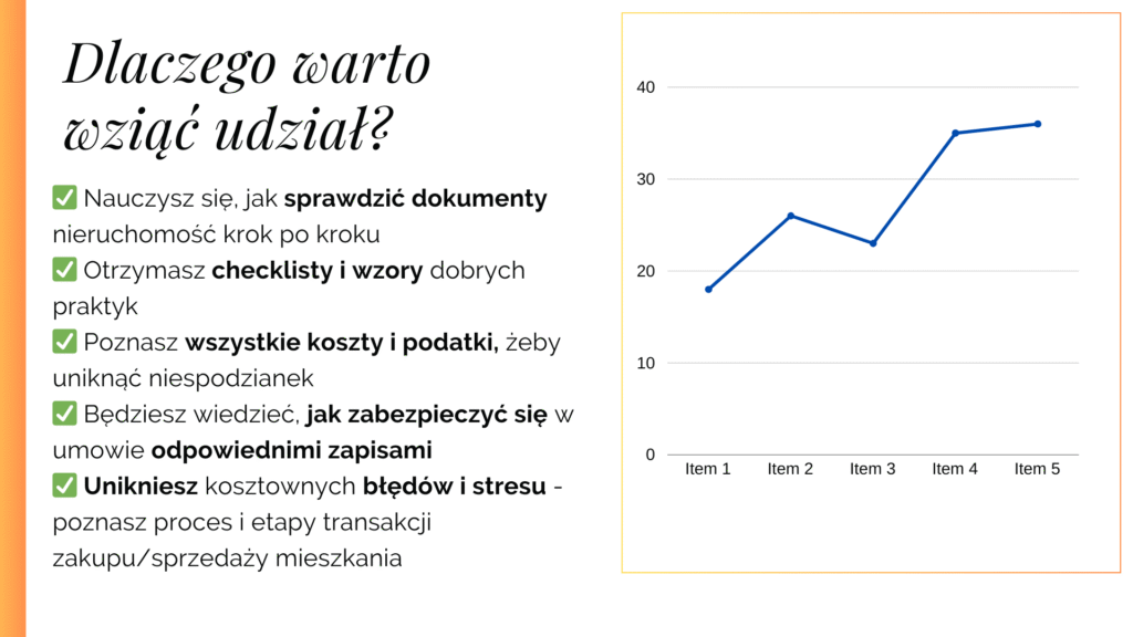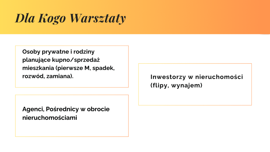 Podczas warsztatów i szkoleń dzielę się praktycznym doświadczeniem, które pozwala moim Uczestnikom bezpieczniej i pewniej poruszać się po rynku nieruchomości – zarówno w roli sprzedającego, kupującego, jak i inwestora.