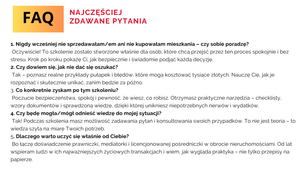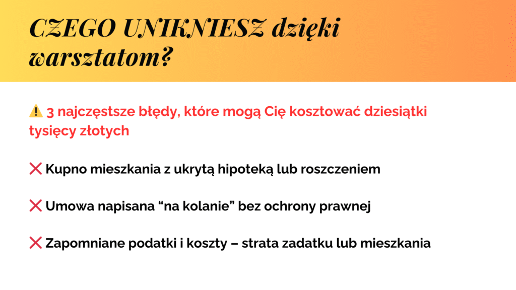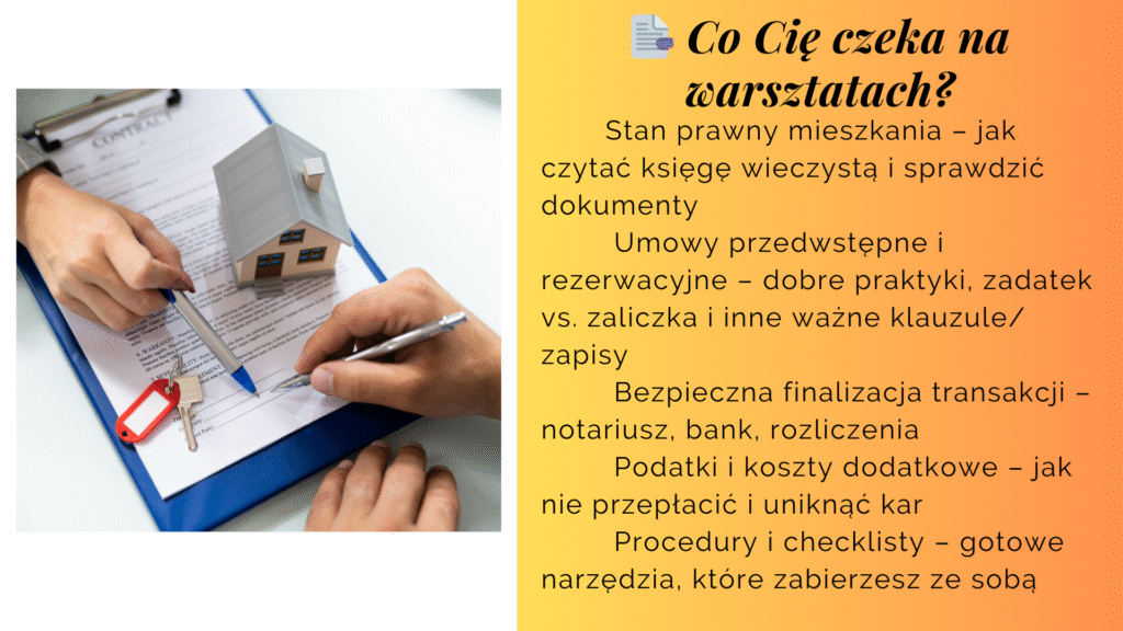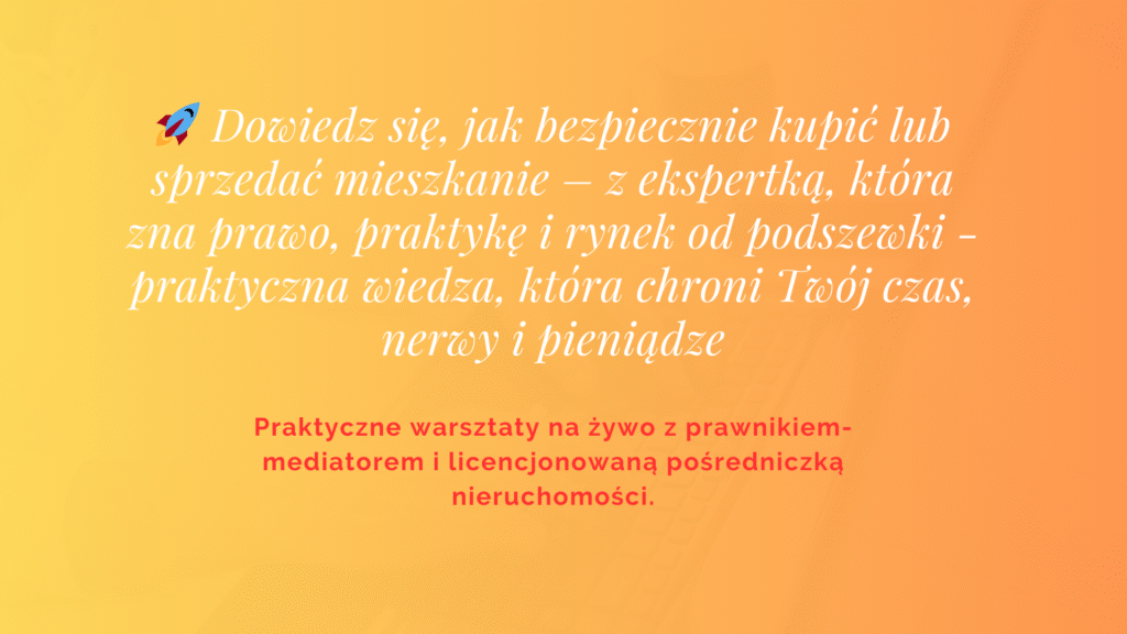 Praktyczne warsztaty na żywo z prawnikiem-mediatorem i licencjonowaną pośredniczką nieruchomości. Pigułka wiedzy prawnej, praktyk na rynku i ewentualnych zagrożeń przed którymi pokażę Ci , jak się zabezpieczyć!