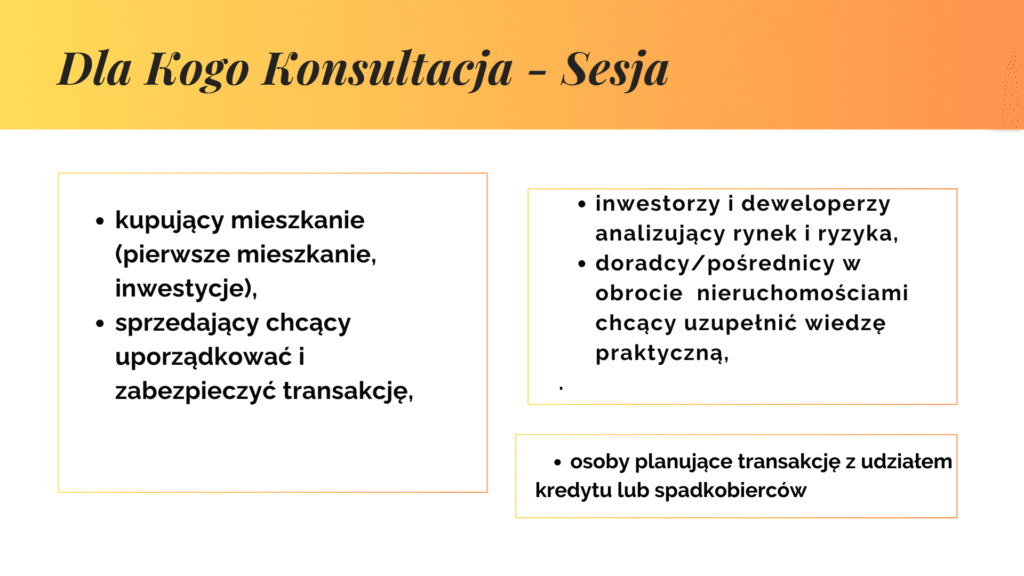 Umów sesję merytoryczną z ekspertem prawa nieruchomości — analiza księgi wieczystej, omówienie kpl dokumentów, procedura i propozycja strategii transakcji kupna-sprzedaży. Konsultacja trwa max 60 min.