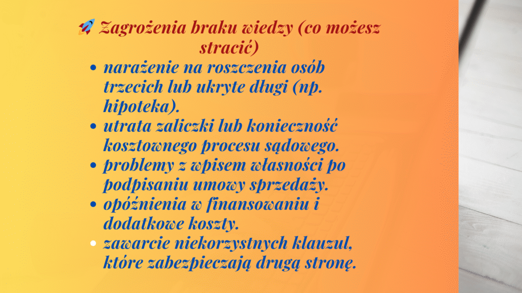 - Weryfikacja księgi wieczystej i ryzyk prawnych.