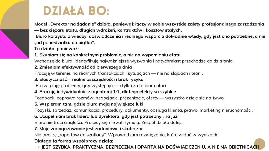 Wchodzę do biura dokładnie tam, gdzie jest największy problem: brak czasu, kadry, procedur, słabe wyniki, chaos, trudne transakcje — i naprawiam to od środka.